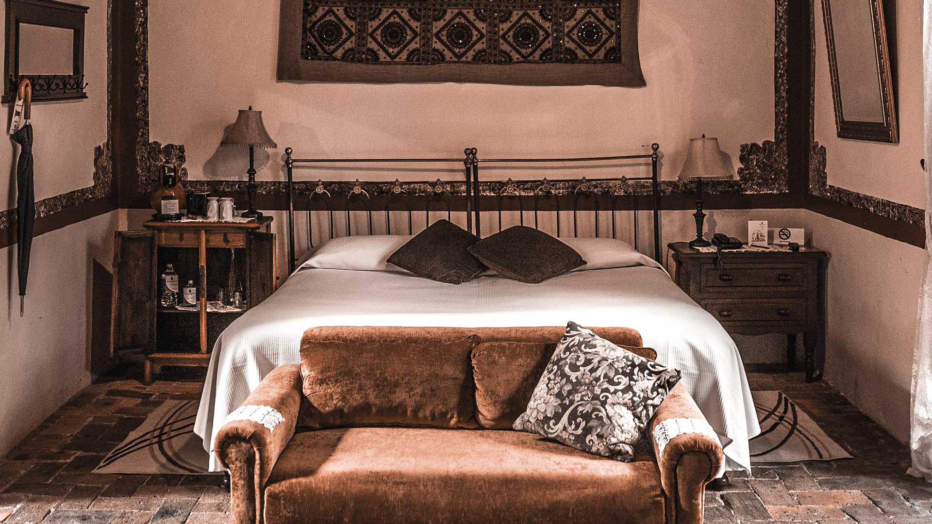 Acogedora y confortable Junior Suite con cama king size y baño con tina de mármol. Está localizada en el primer patio de la casa y su nombre se debe a que hace muchos años, la cama con “colchón de tambor” ya muy vencidos y viejos se sumían al acostarse las parejas los cuales se deslizaban al centro de la cama listos para reconciliarse.